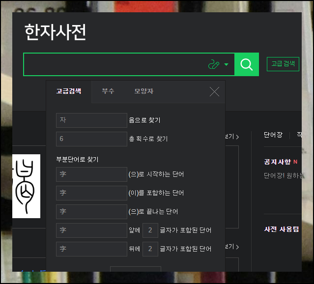 온라인 사전에서 고급 검색 버튼을 누르면 다양한 검색 옵션이 나타나요. 음, 획수, 부수 등 여러 방법으로 한자를 찾을 수 있는데, 오늘은 부수를 이용한 방법을 상세히 알아볼게요. 각 기능은 직관적이어서 이해하기 쉽습니다.