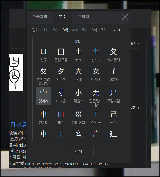 부수로 한자찾기 진행한 후에는 많은 결과가 나올 수 있어요. 이때는 획수 전체 박스에서 찾으려는 한자의 획수를 선택하면 결과가 훨씬 좁혀집니다. 디지털 사전의 장점을 활용해 원하는 글자를 클릭해보세요.