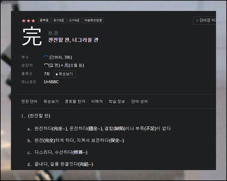 기본적인 사전정보 외에도 유의어와 연관 문자를 확인할 수 있어요. 특히 글자를 쓸 때 도움이 되는 획순 정보도 제공됩니다. 이런 부가 정보들이 실력 향상에 큰 도움이 되죠.