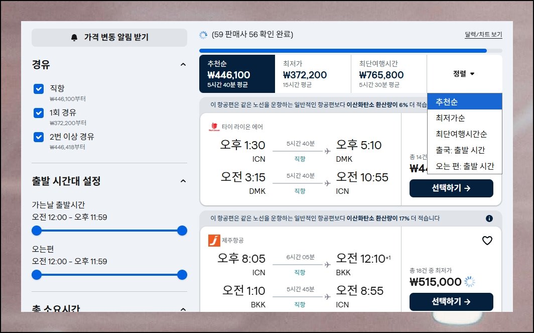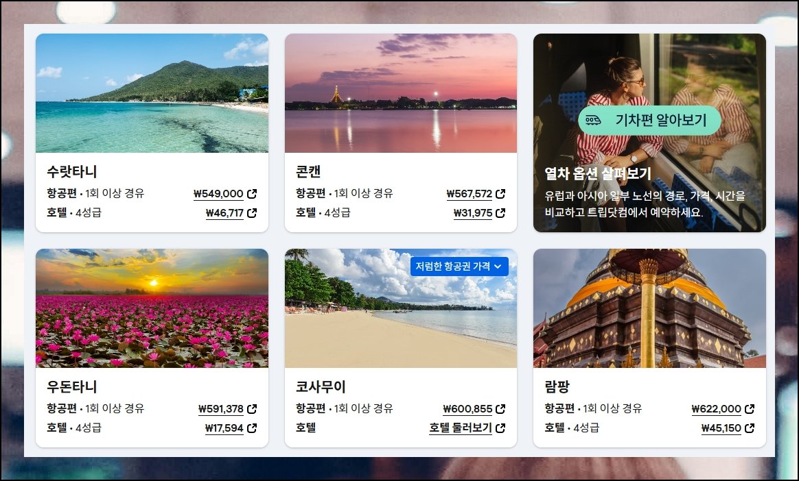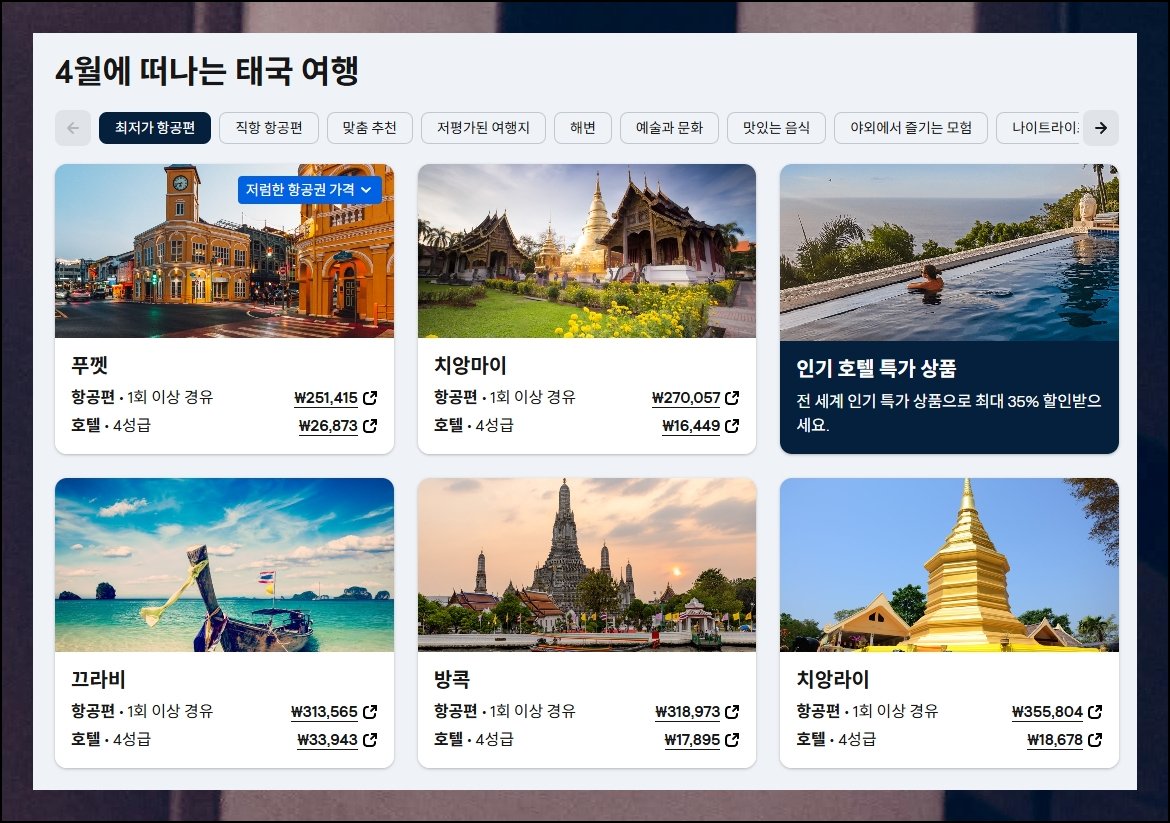 방문할 국가가 정해져 있다면 도시 이름 대신 나라 전체를 넣어 보세요. 비행기표 사는법 중에서도 알뜰한 방법입니다. 태국의 경우 수도권 외에 북부와 남부 휴양지까지 최저 운임이 나란히 표시돼요. 특정 지역을 고집하지 않으면 싸게 잡을 경로가 훨씬 다양해집니다.