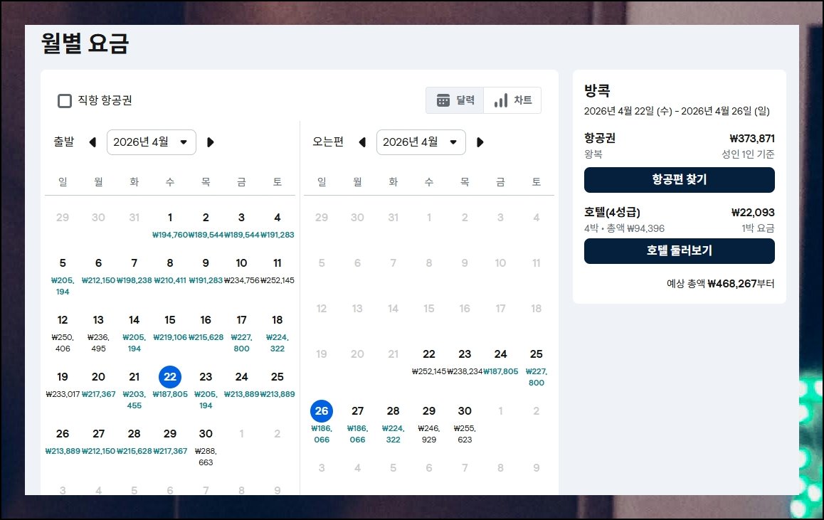 조회 범위를 한 달 단위로 넓히면 일자별 운임표가 펼쳐져요. 비행기표 싸게 사는법의 핵심이 바로 이 달력 기능입니다. 동일 노선이라도 며칠 간격으로 금액 편차가 상당해요. 주중 출발이 주말보다 저렴한 경우가 많으니 이틀만 앞뒤로 옮겨도 예산이 눈에 띄게 절감됩니다.