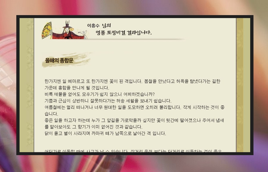 입력한 정보를 토대로 나의 운에 대한 분석이 진행됩니다. 1분 이내로 완료되오니 조금만 기다려 주세요.