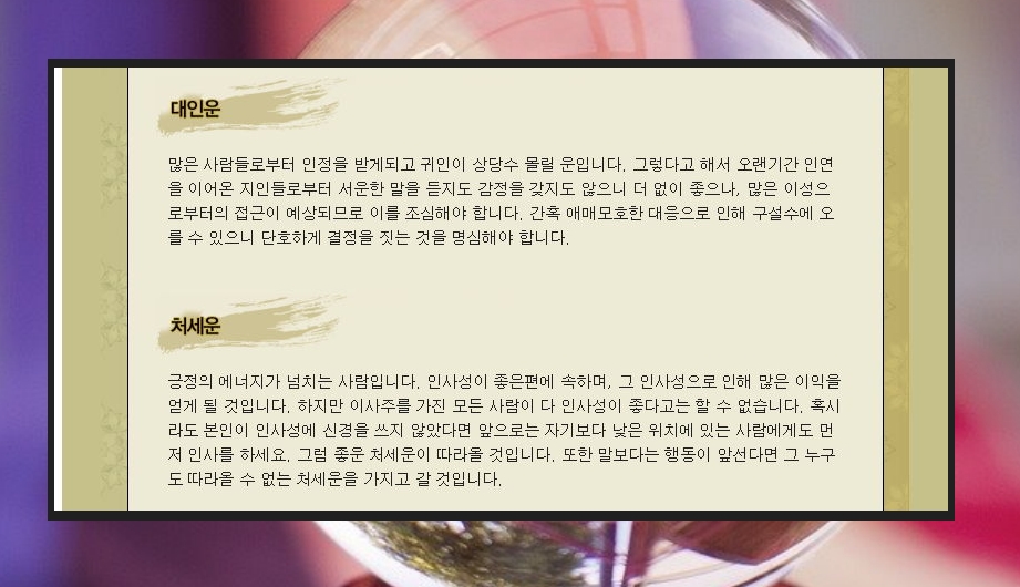 사회생활을 할 때에는 대인운이나 처세운을 참고하면 좋겠죠? 사주팔자의 풀이를 통해 자신이 어떤 사람인지를 알 수 있고, 그에 따라 어떻게 행동하는 것이 좋은지 간단히 알 수 있습니다.