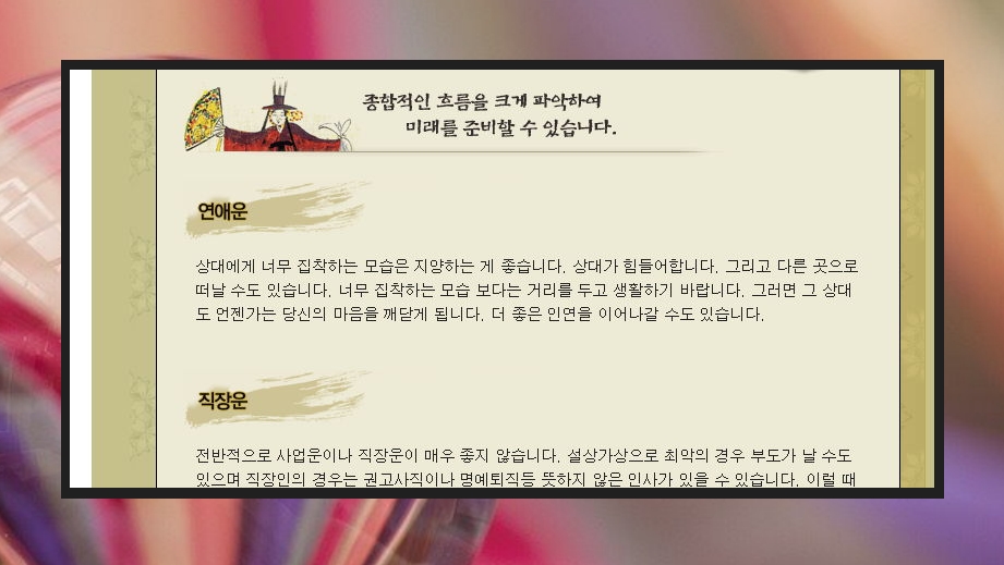 같은 앞날에 대해 궁금하다고 해도 사람에 따라 관심사가 다를 수 있습니다. 그럴 때에는 부분적으로 간단히 볼 수 있도록 연애운, 직장운, 금전운 등이 마련되어 있는데요. 조심해야 할 것이나 도움이 될만한 조언을 알려주기 때문에 유용하게 활용할 수 있습니다.