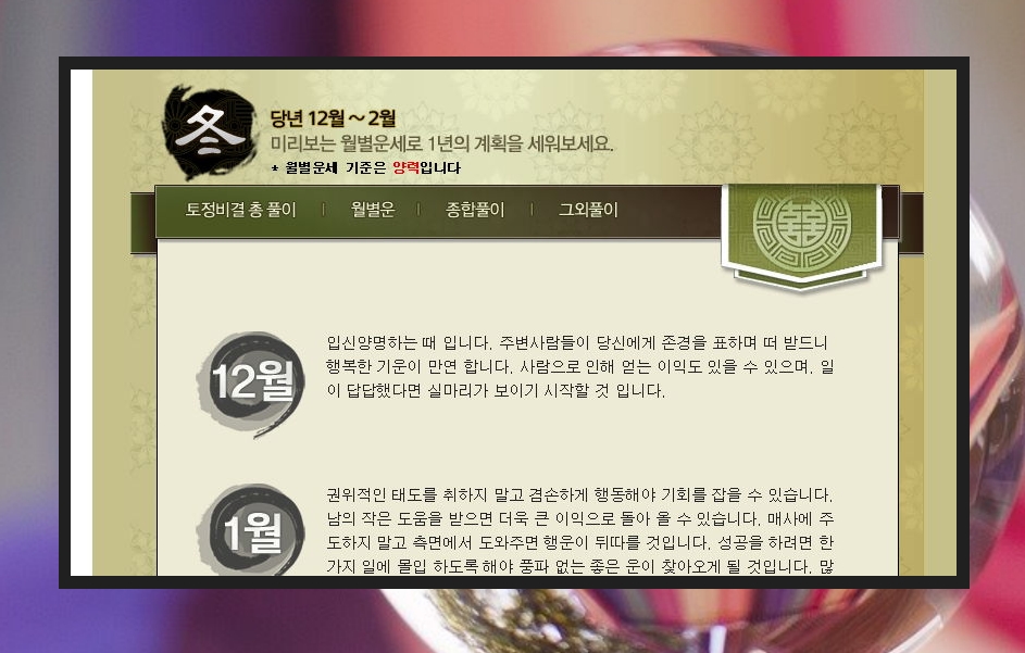 그 다음으로는 월마다 무슨 좋은 일이 있는지 어떤 것을 조심해야 하는지 알 수 있는 월별운세가 나타나는데요. 하고자 하는 일이 있다면 사주팔자 풀이를 참고하시면 좋습니다. 꼭 맞는지는 모르겠지만, 피해야 할 때는 피하는 것이 나쁘지 않다고 생각되네요.
