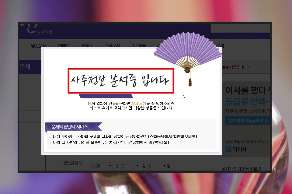 미래가 궁금하셨죠? 예전엔 특별한 사람만 볼 수 있었어요. 하지만 이젠 달라요! 인터넷으로 누구나 무료로 사주팔자 볼 수 있어요. 풍부한 해석도 간단히 볼 수 있어요. 어떻게 하는지 궁금하시죠? 함께 알아볼까요? 이제 집에서 편하게 나의 운명, 살펴보세요!
