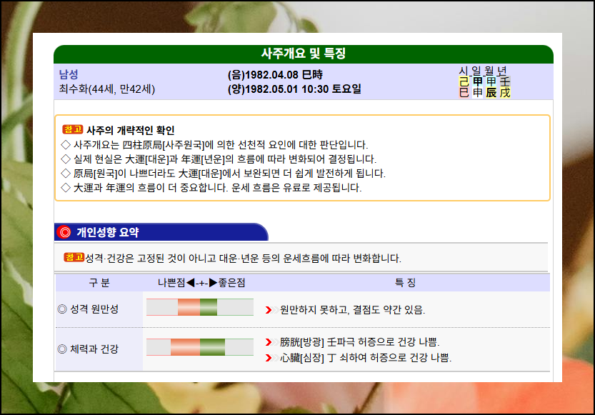 특히 성격과 건강에 관한 상세 자료가 제공되니 꼼꼼히 살펴보세요. 운세 서비스에서는 정확한 데이터가 정확한 결과로 이어진다는 점을 기억하세요.