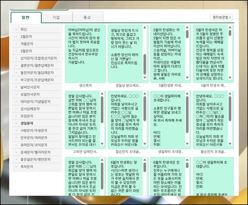 좌측 패널에 장면별 구분이 보기 좋게 나열되어 있습니다. 생일축하 분류를 클릭하면 쏠쏠한 메세지 모음집이 바로 펼쳐져요. 곁에 딸려 나오는 앙증맞은 그림도 같이 써 보길 권합니다. 조그만 시각 요소 하나가 더해지는 것만으로도 축하 메세지의 온도가 확 올라갑니다.
