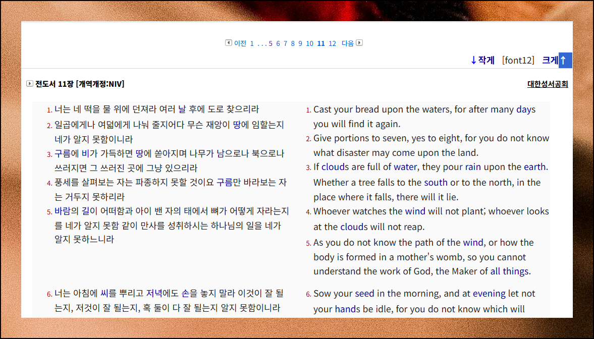 사실 굳이 파일을 받아서 저장할 필요는 없다고 봐요. 웹사이트를 통해 언제든지 접속해서 성경읽기를 할 수 있거든요. 제가 애용하는 곳은 홀리바이블이라는 사이트입니다. 국내 번역본뿐만 아니라 해외 언어로 된 말씀까지 다양하게 제공하고 있어요. 성경읽기를 할 때 필요한 보조 자료들도 풍부하게 갖춰져 있어서 매우 만족스럽게 사용하고 있습니다.