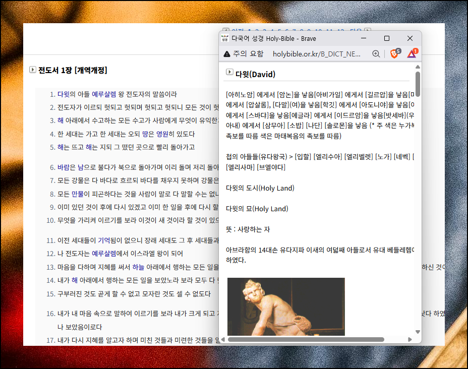 성경읽기를 하다 보면 이해가 안 되는 부분이 생기곤 해요. 대개는 낯선 용어 때문에 그런 경우가 많아요. 홀리바이블에서는 궁금한 단어를 마우스로 눌러보면 연관된 설명이 바로 나타나요. 별도의 검색 없이도 그 자리에서 의미를 파악하는게 가능해서 좋습니다.