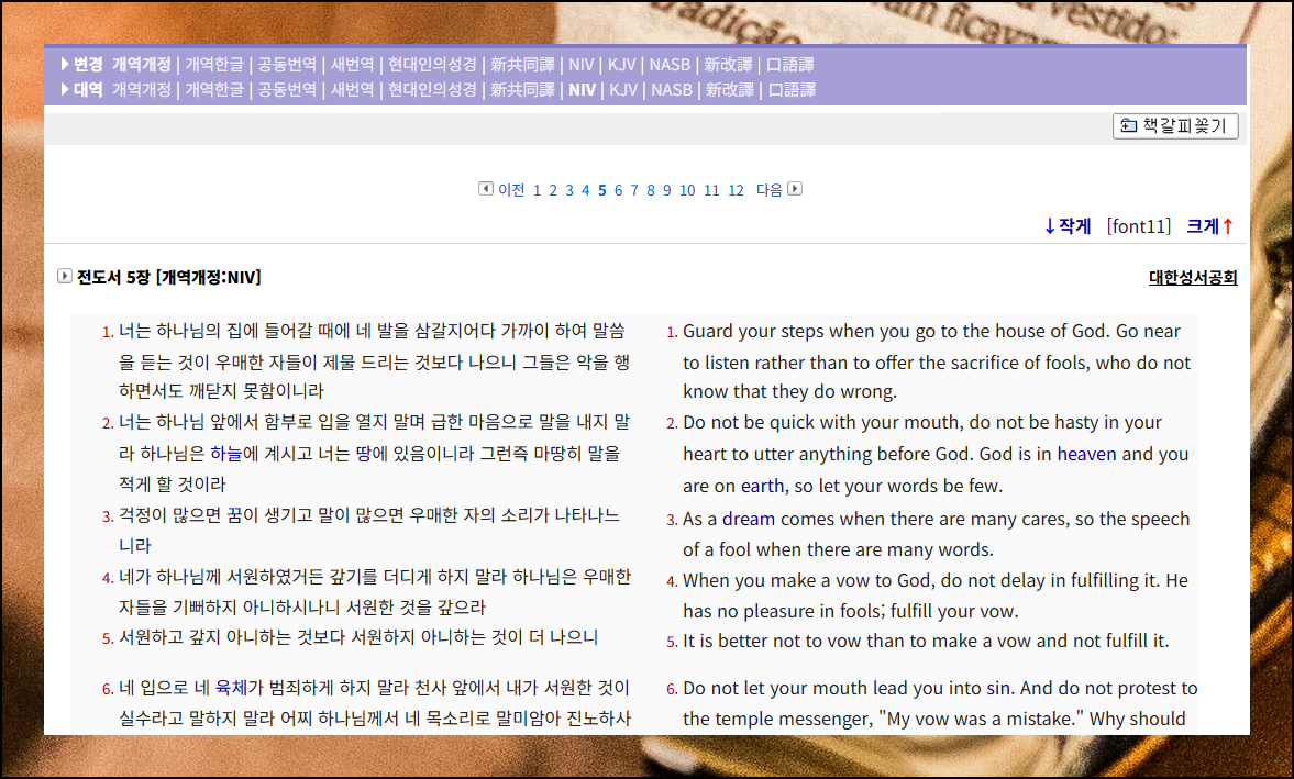 정말 유용한 기능을 하나 더 말씀드릴게요. 한국어와 영어 본문을 나란히 비교하며 성경읽기를 실행하는게 가능하다는 점이에요. 화면 위쪽의 대역 메뉴에서 niv, kjv, nasb 중 하나를 선택하면 우측에 영문 번역이 함께 표시됩니다. 중국어와 일본어로도 비교해서 읽는 것이 가능하니까 외국어 학습에도 도움이 될 것 같아요.