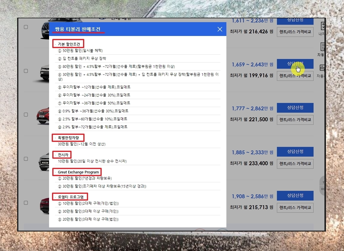 리스트 상에서 [신차 판매조건보기]를 클릭해 봅시다. 그럼 해당 차량 모델을 구매하는 경우 이용할 수 있는 판매조건을 확인할 수 있습니다. 매월마다 최신으로 업데이트가 됩니다. 구체적인 최종 가격을 확인하고 싶다면 화면 우측에 있는 [상담신청]을 클릭하면 됩니다.