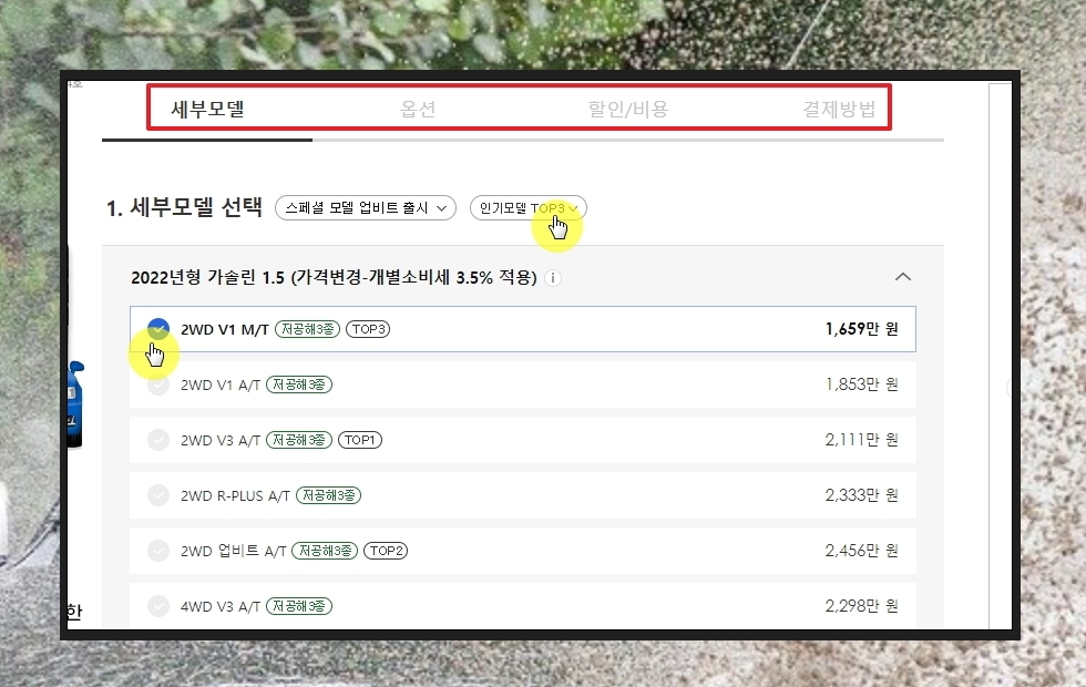 몇 가지 단계를 거치면 내가 원하는 조건의 소형 suv 차량을 구매할 때 비용이 얼마나 발생하는지 알 수 있습니다. 먼저 세부모델부터 입니다.
