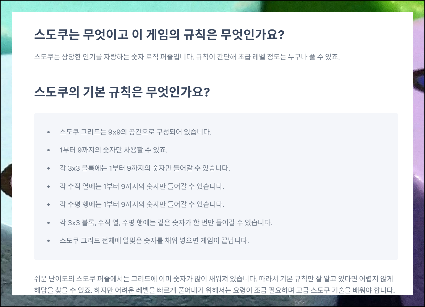 스도쿠 규칙이 헷갈린다면 우측 상단의 규칙 메뉴를 확인해보세요. 기본적인 내용부터 고급 전략까지 모든 것이 자세히 설명되어 있어요. 초보자도 쉽게 따라할 수 있도록 친절하게 안내가 되어 있습니다.