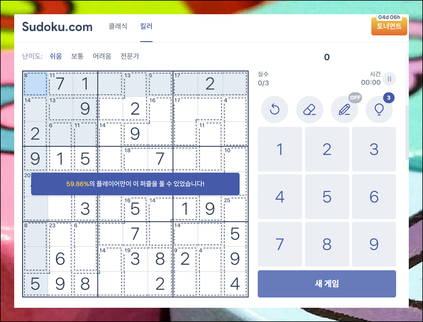 킬러 버전에서는 색다른 도전이 기다리고 있어요. 점선으로 나뉜 영역의 숫자 합을 맞추는 특별한 방식입니다. 기존 스도쿠와는 다른 재미를 느낄 수 있어요. 규칙 메뉴에서 자세한 설명을 확인하고 새로운 방식을 게임하기 가능습니다.