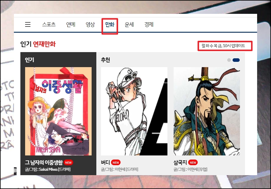 이곳에 처음 접속하면 여러 가지 연예인 및 스포츠 기사가 보일 텐데요. 나중에 보기로 하고, 일단은 메뉴에 있는 [만화]를 선택해 주세요. 그럼 현재 인기 있는 연재작품을 시작으로 많은 완결된 무료만화 리스트가 나타납니다. 이곳에서 제공하는 연재 작품의 경우에는 평일 10시에 업데이트가 주기적으로 되오니 참고해 주세요.