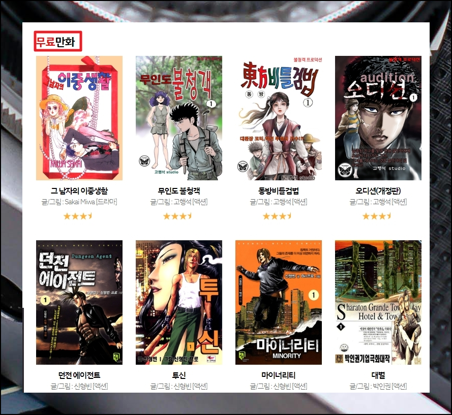 연재작 아래를 보면 스포츠서울 무료만화 시리즈가 쭉 나오는데요. 요즘에는 평점도 제공하고 있어서 어떠한 것이 인기가 많은지 쉽게 파악할 수 있습니다. 예전에는 스포츠서울 사이트에 무협 장르가 많았었는데요. 요즘에는 액션이나 연애 장르도 많이 올라와 있네요. 국내 유명 작가인 고행석, 신형빈, 박인권, 김철호, 조명운 등의 작품을 무료만화 서비스로 볼 수 있어서 정말 좋습니다.