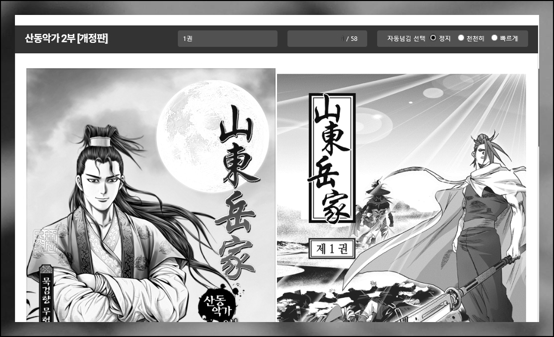스포츠조선 사이트에서 보고 싶은 작품은 하나 선택해 보았습니다. 산동악가 2부 개정판인데요. 개정판이라 그런지 화질이 매우 좋네요. 한 화면에 2페이지씩 감상할 수 있도록 되어 있습니다.