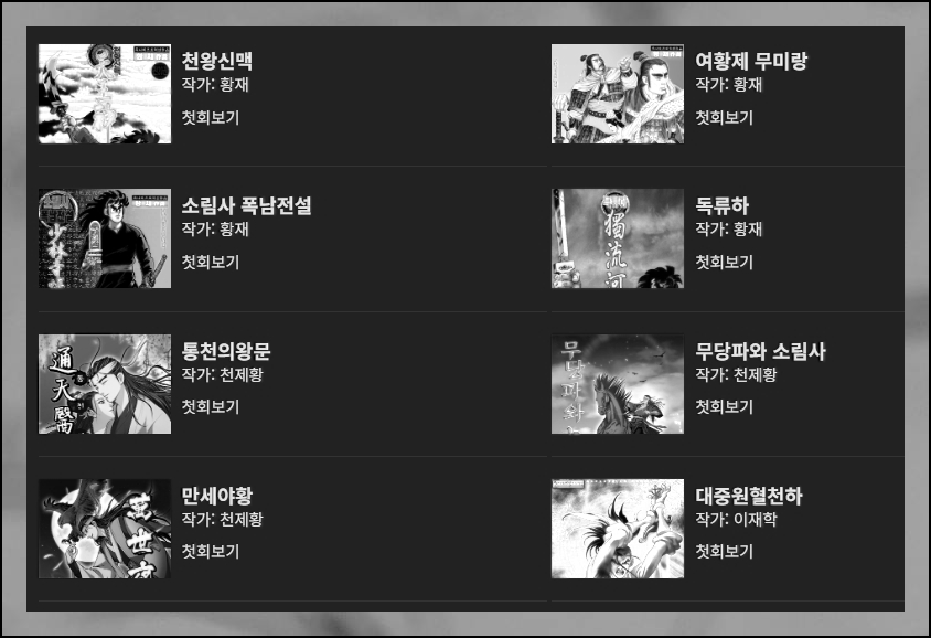 국내 유명 작가인 천제황, 조명운, 이재학, 오일룡, 박인권, 묵검향 등 이름만 들으면 알만한 분들의 작품을 만나볼 수 있는데요. 사망검혼, 야간항로, 용호린, 풍운의 불새, 도시의 얼간이, 희망의 스트라이커 등 국내에서 인기 있는 무협장르는 물론이고, 스포츠나 드라마, 학원물 같은 장르도 풍부하게 만나볼 수 있습니다.