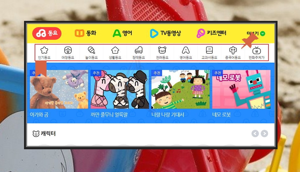 인기곡, 애창곡, 놀이곡, 생활, 창작, 전래동요, 영어동요 등 종류가 정말 다양한데요. 화면 아래로 내려가면 만화 캐릭터들의 율동곡도 볼 수 있습니다. 아기에게 율동을 시키고 싶을때 이용하면 좋아요. 그럼 인기곡으로 아기 동요 무료 듣기를 해보겠습니다.