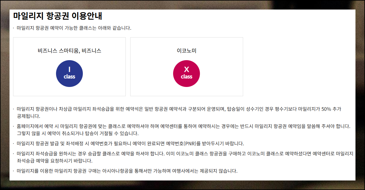 대한민국 경유 이원구간도 아시아나 포인트로 이용 가능합니다. 상위 등급 좌석일수록 더 많은 적립금이 요구되니 여행 계획 시 참고하세요.