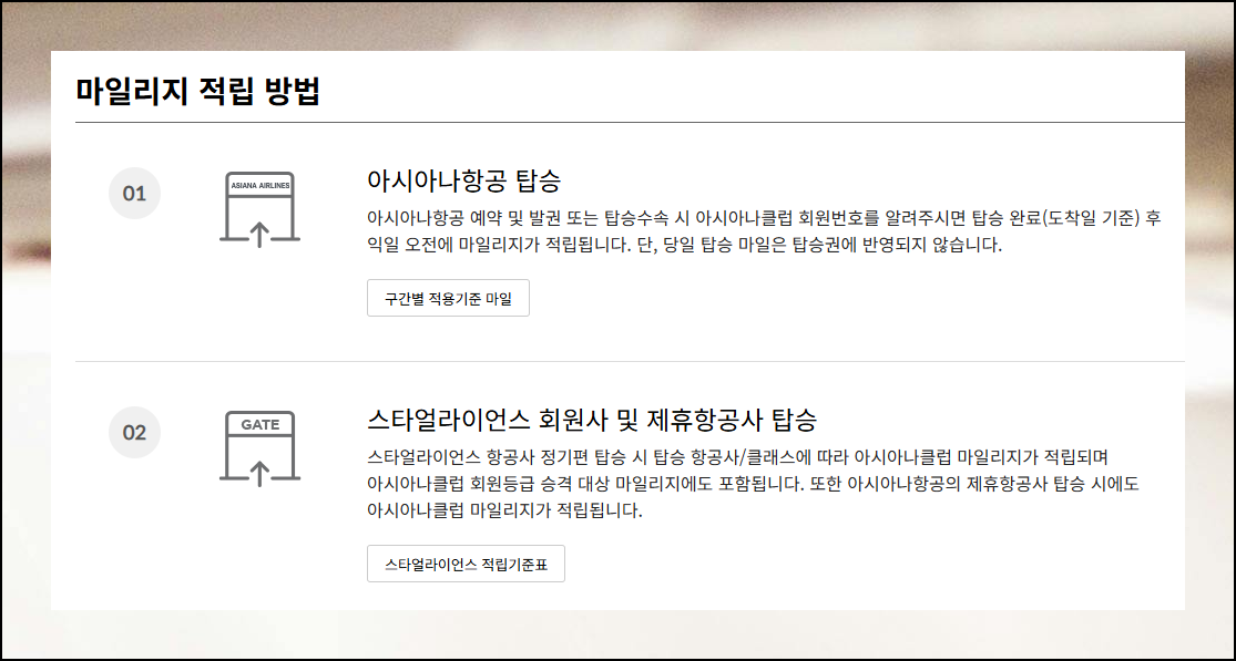 포인트 적립은 여러 가지 방법으로 할 수 있습니다. 아시아나 탑승, 스타얼라이언스 및 제휴항공사 이용, 그리고 다양한 파트너사 서비스 활용이 그것입니다. 당일 탑승 적립내역은 즉시 반영되지 않으니 참고해 주세요.