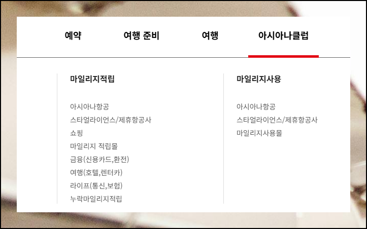 초기화면의 "아시아나 클럽" 메뉴를 선택해 주세요. 커서를 올리면 펼쳐지는 하위 카테고리에서 적립과 활용에 관한 모든 안내를 찾을 수 있어요.