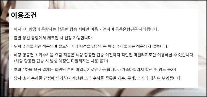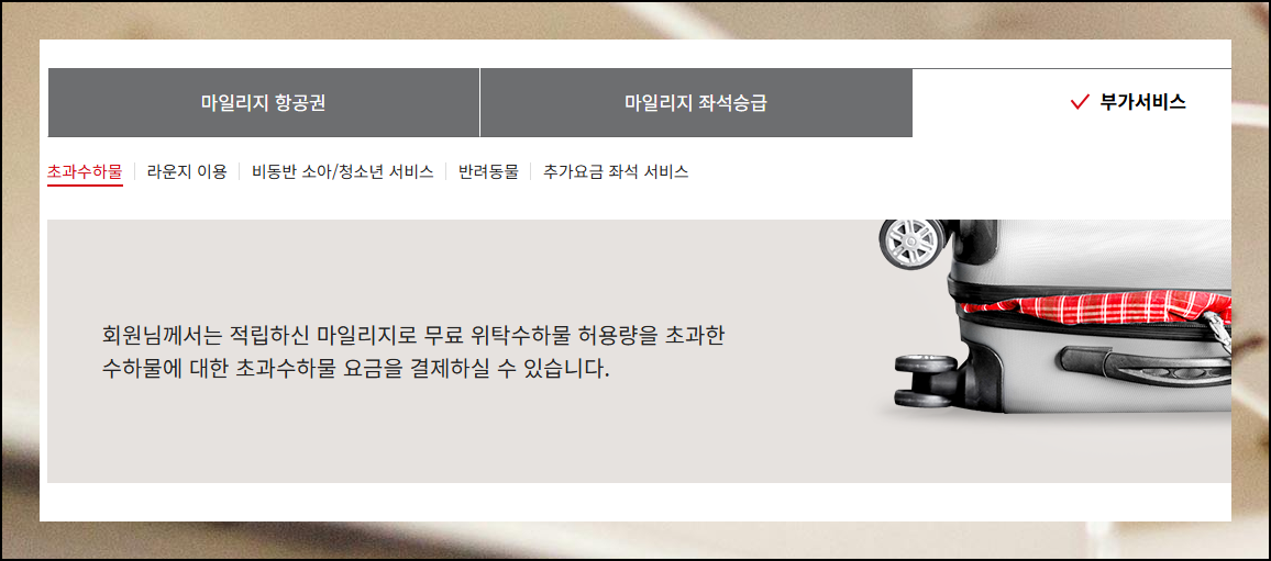 소소한 마일리지의 경우라도 부가서비스에 활용하면 좋습니다. 초과수하물 요금 지불 등 작은 포인트로도 실질적인 혜택을 누릴 수 있어요.