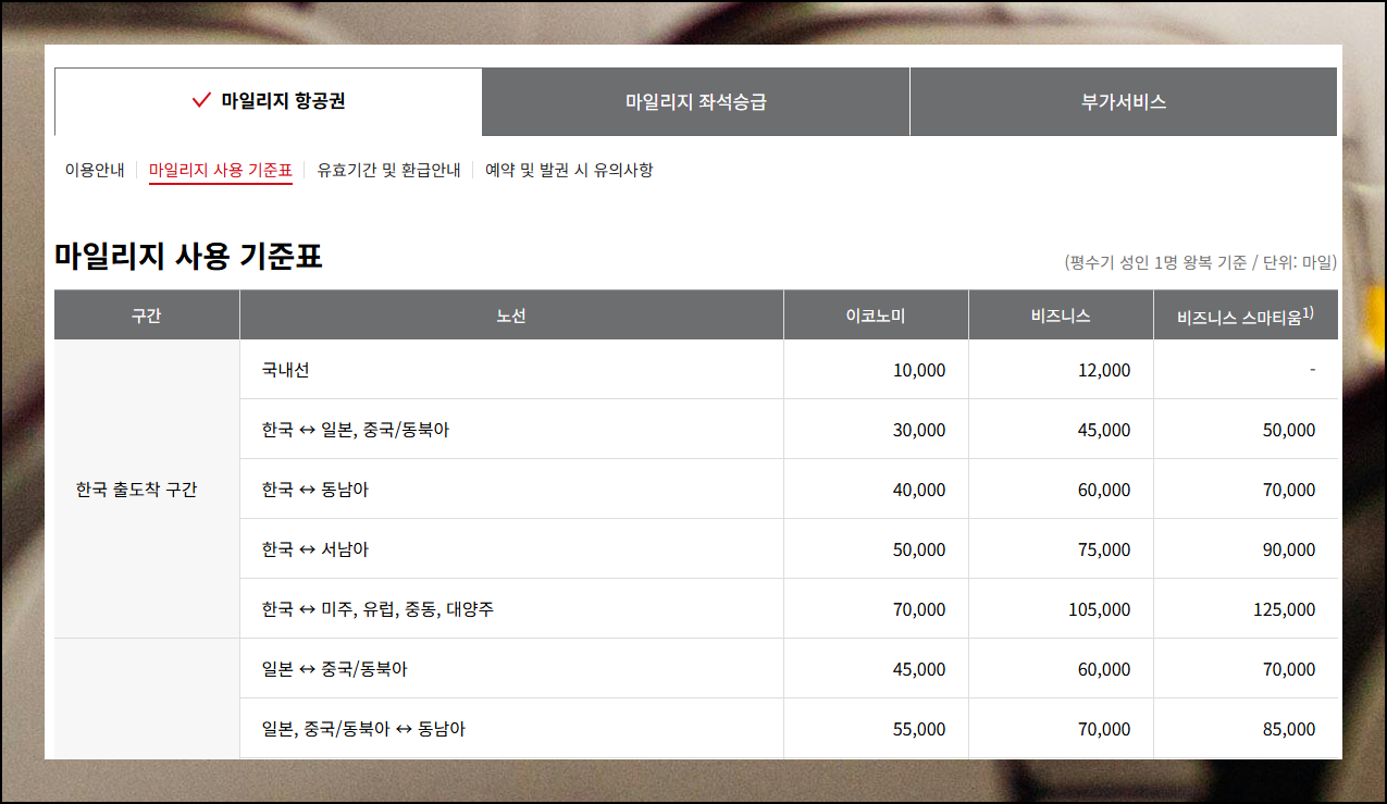 활용 기준표는 노선과 좌석 등급별 필요 마일리지를 보여줍니다. 이 차트를 통해 보유 포인트로 어디까지 여행 가능한지 쉽게 확인할 수 있어요.