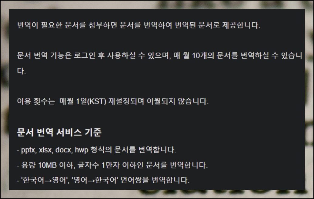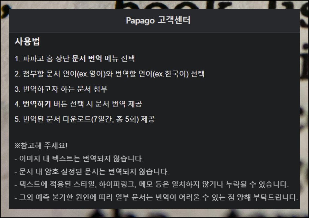 영어문장 번역기를 사용할 때에는 몇 가지 제약 사항이 있어요. 이미지 속 글씨는 인식하지 못하고, 암호 보호된 파일도 처리가 안 됩니다.