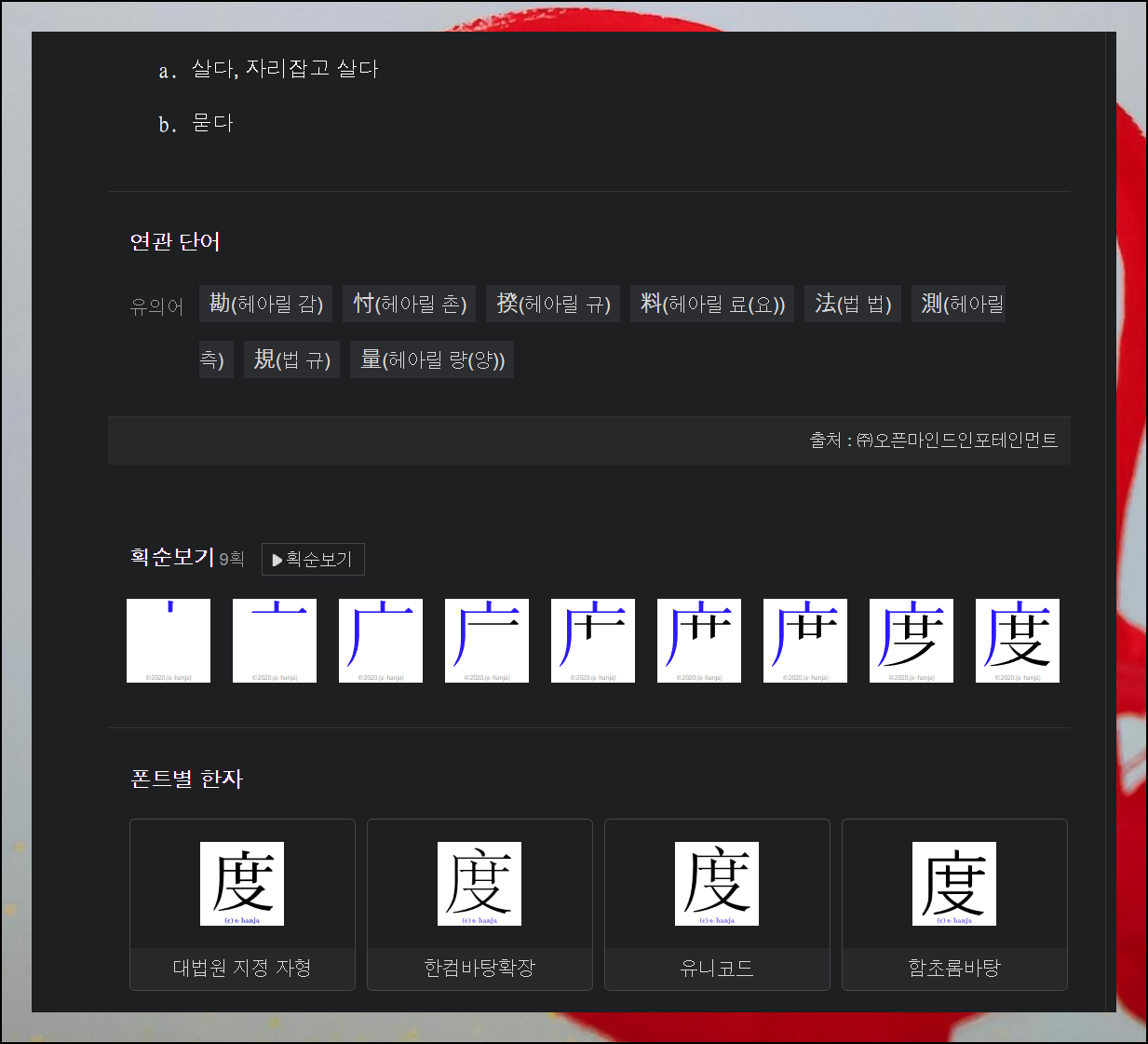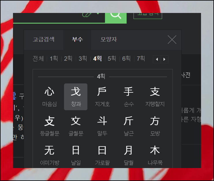 글자의 전체 획수를 세어서 검색하는 방법도 있습니다. 이것은 옥편에서 사용하는 가장 기본적인 분류 방식이에요. 찾기를 원하는 문자의 획을 하나씩 세어본 다음 그 숫자를 입력하면 같은 획수를 가진 글자들이 모두 나타납니다.