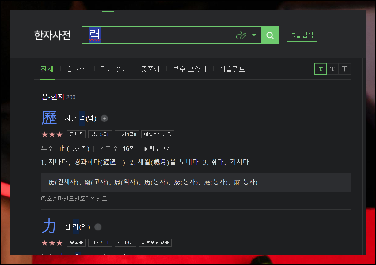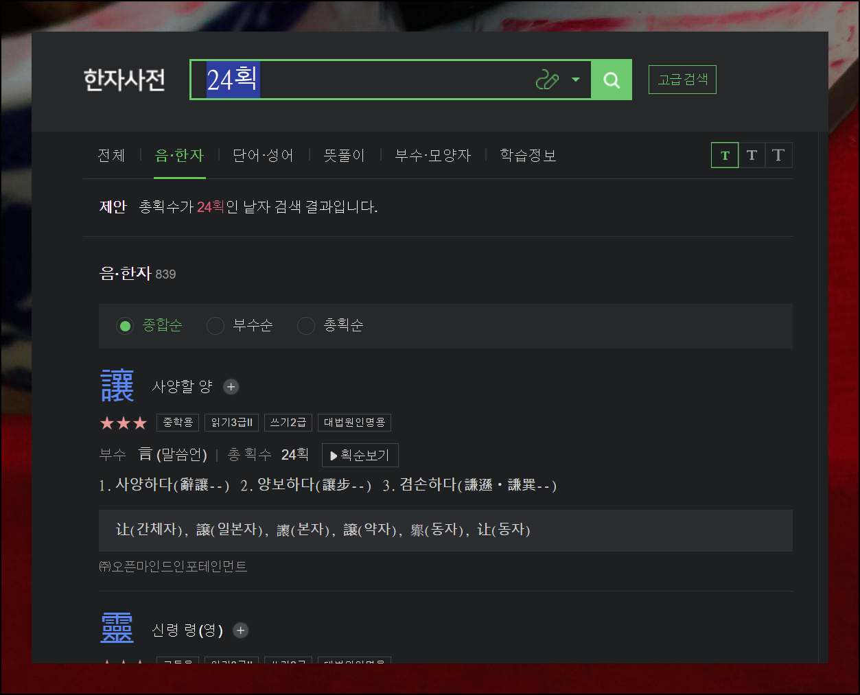 문자의 읽는 방법을 알고 있다면 음으로 검색하는 방법을 사용해 보세요. 검색창에 한글로 음을 입력하고 검색하면 동일한 음을 가진 모든 글자들이 목록으로 나타납니다. 이 방법의 장점은 속도가 빠르다는 것이에요.