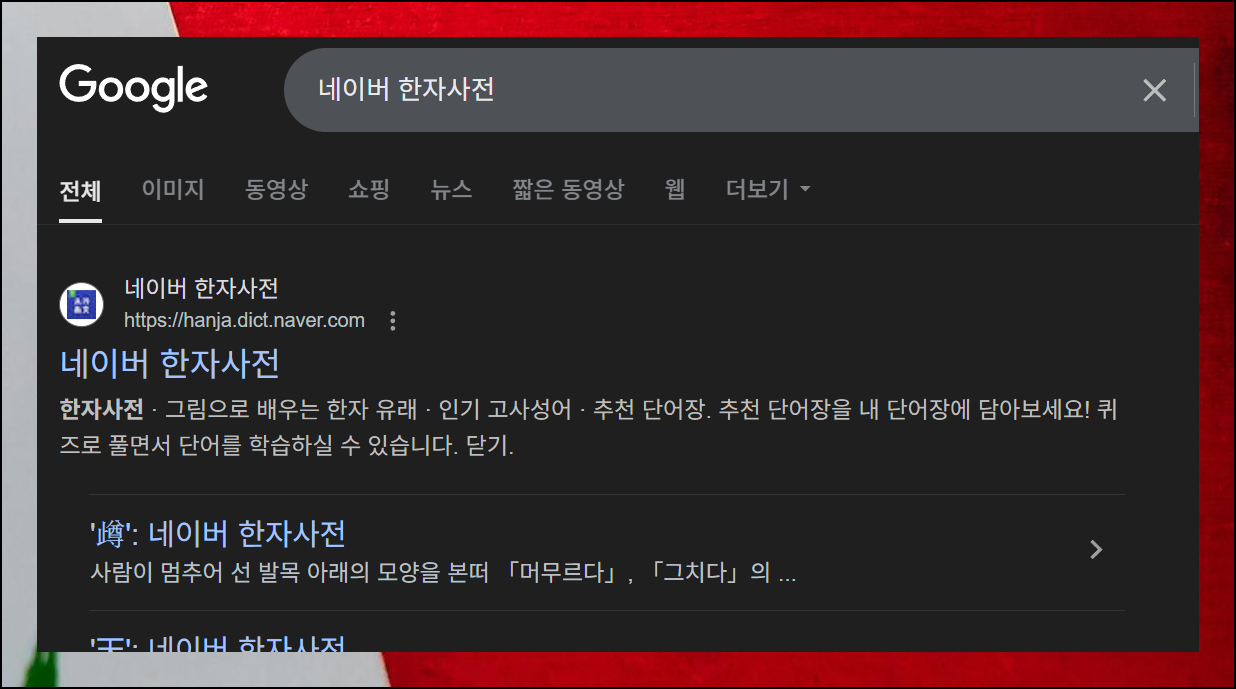 문자의 읽는 방법을 알고 있다면 음으로 검색하는 방법을 사용해 보세요. 검색창에 한글로 음을 입력하고 검색하면 동일한 음을 가진 모든 글자들이 목록으로 나타납니다. 이 방법의 장점은 속도가 빠르다는 것이에요.