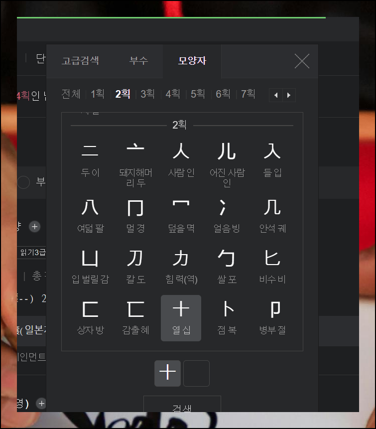 글자의 전체 획수를 세어서 검색하는 방법도 있습니다. 이것은 옥편에서 사용하는 가장 기본적인 분류 방식이에요. 찾기를 원하는 문자의 획을 하나씩 세어본 다음 그 숫자를 입력하면 같은 획수를 가진 글자들이 모두 나타납니다.
