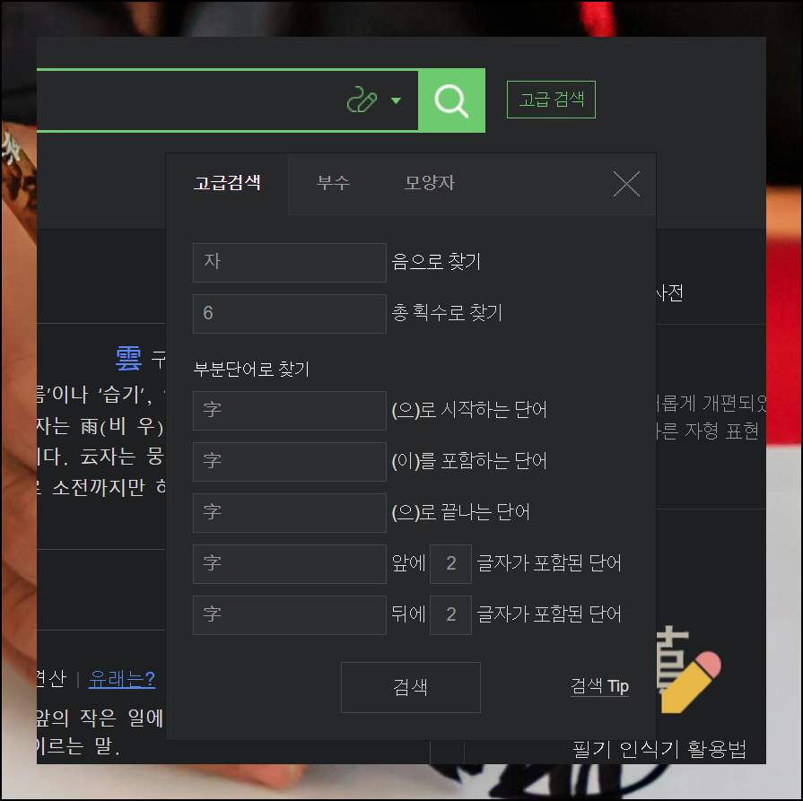 메인 검색창 오른쪽에 위치한 고급검색 버튼을 눌러보세요. 클릭하면 여러 가지 검색 옵션들이 담긴 새로운 창이 열립니다. 이곳에서는 부수검색, 음검색, 획수검색 등의 다양한 방식으로 한문찾기 진행이 가능해요. 자신에게 가장 적합한 방법을 선택해보세요.