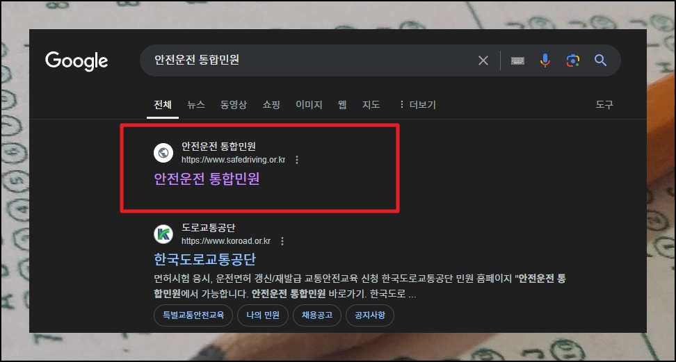 최근 들어 도로교통공단 사이트가 개편이 되었습니다. 안전운전 통합민원 사이트가 추가 되었는데요. 추가된 사이트에서 필기시험 예상문제 자료를 다운 받을 수 있어요. 메인화면 중앙 우측에 있는 [안전운전 통합민원]을 클릭해 주세요.