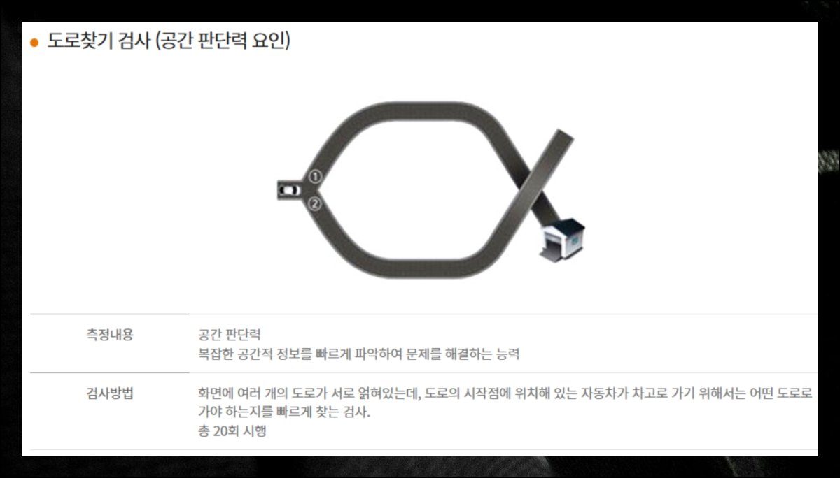 나머지 네 가지는 실제 도로에서 필요한 고령운전자의 판단력과 기억 능력을 점검하는 내용들입니다. 여러 갈래 길이 존재하는 복잡한 구간에서 목적지로 향하는 경로를 정확히 선택할 수 있는지 확인해요.