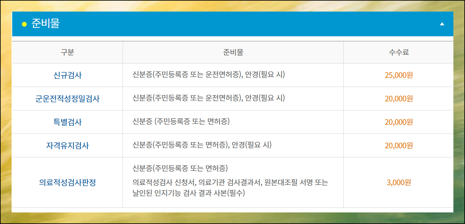 심사 종류마다 지참물이 조금씩 달라요. 기본적으로 신분증은 꼭 필요하고, 안경을 착용하시는 분들은 반드시 가져오셔야 합니다. 수수료도 기억하세요. 의료적성검사는 준비해야 할 것이 많은데요. 그에 반해 비용이 3천원으로 저렴합니다.