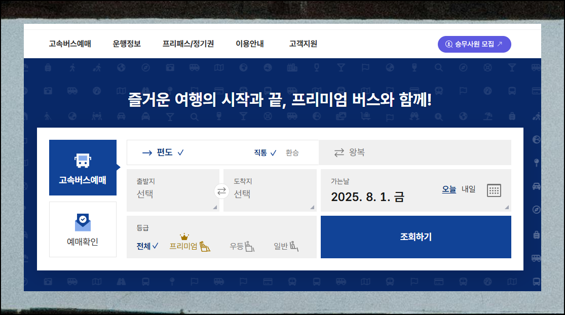 출발지와 도착지 정보는 물론이고 여행 날짜와 버스 등급까지 모든 필수 항목을 정확하게 입력해야 해요. 원주고속버스터미널 예매에 필요한 정보를 모두 작성한 후에 조회하기 버튼을 클릭하시면 됩니다.
