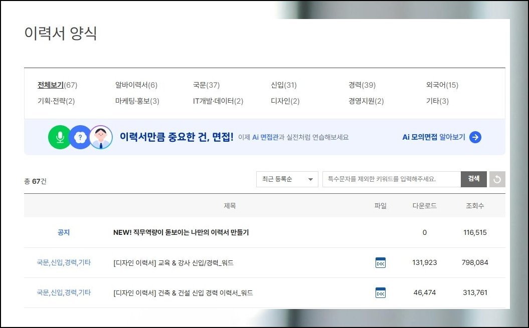 취업 자료 페이지 안쪽에는 이력서 양식만 따로 모아둔 공간이 독립적으로 꾸려져 있어요. 용도에 맞춰 원하는 파일을 수월하게 추려낼 수 있도록 짜인 구조입니다. 무료 다운로드 흐름 또한 헤맬 걱정 없이 단순하고 직관적으로 설계돼 있어요. 검색 창에 키워드를 넣으면 후보군이 즉시 좁혀집니다.