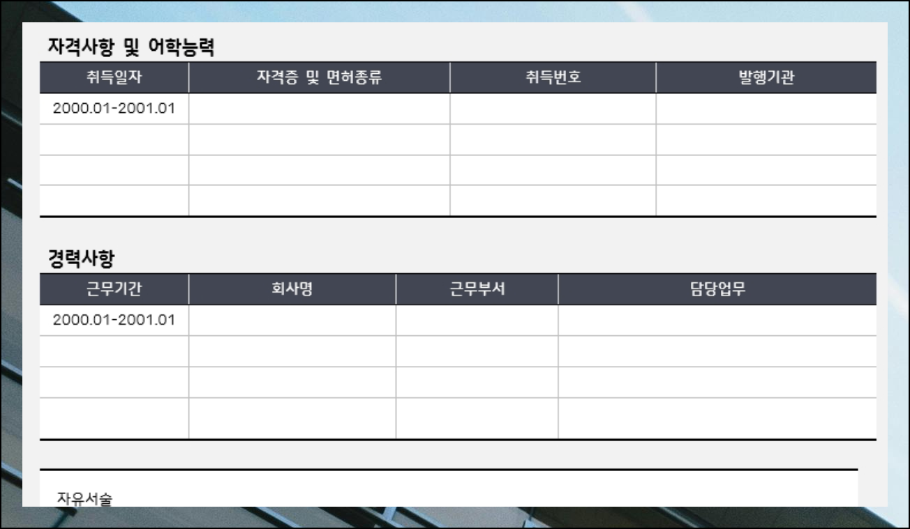 전문가들이 만든 해당 양식은 채용 담당자들이 선호하는 형식과 구성을 갖추고 있어 합격률을 높이는 데 도움이 됩니다. 더불어 신입, 경력직, 외국어 특기자 등 다양한 상황에 맞춘 수십가지 양식 중에서 본인의 강점을 부각시킬 수 있는 최적의 양식을 찾아뵤세요.