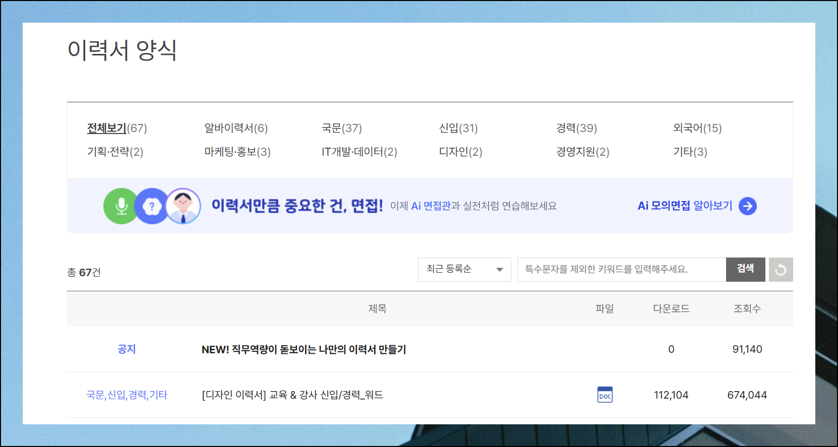 여러 가지 이력서 양식 hwp 무료 파일 가운데 개인에게 최적화된 것을 선별하는 작업은 다소 까다로울 수 있습니다. 이런 상황에서는 목록 좌측 상단에 배치된 정렬 옵션을 적극 활용해보세요.