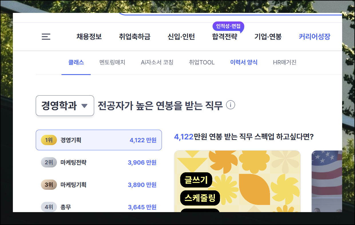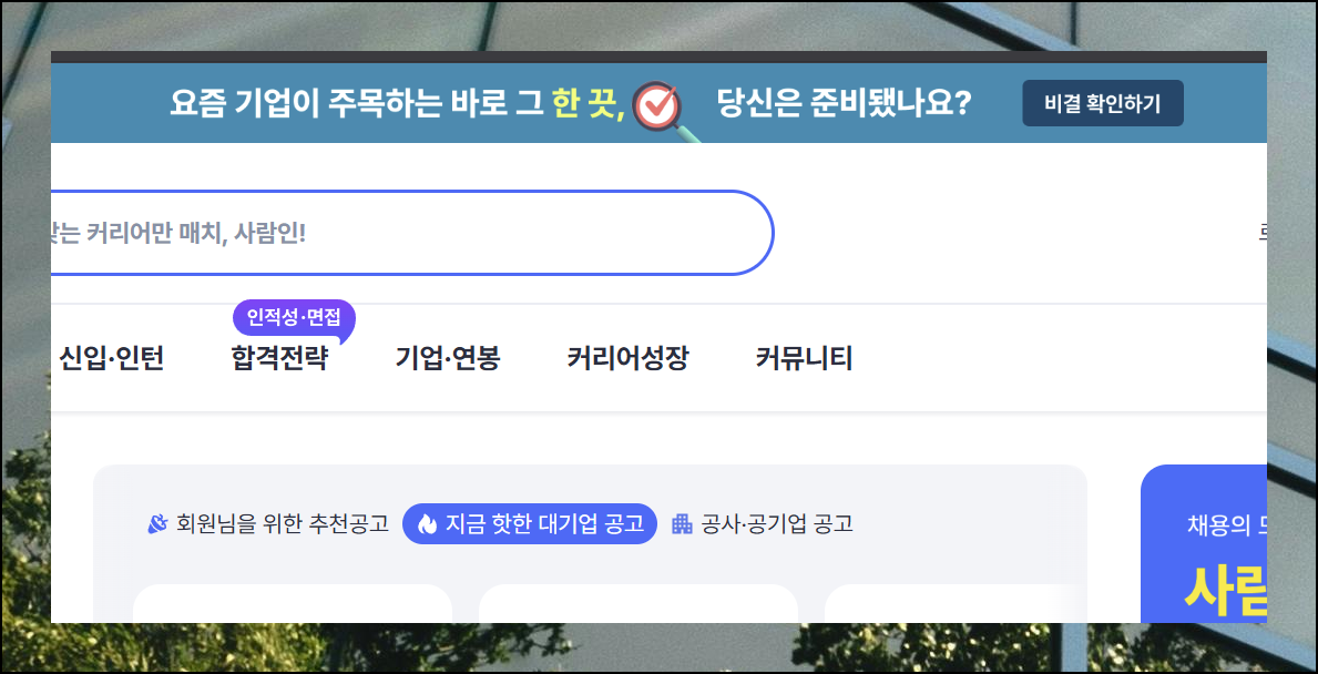 사람인 홈페이지 상단 영역에는 다양한 메뉴 옵션들이 배열되어 있습니다. 화면 오른쪽 끝에 위치한 커리어 성장 항목을 찾아서 선택해주세요. 이 섹션에서 이력서 관련 전체 리소스를 한눈에 확인할 수 있습니다.