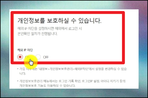 이메일 계정을 더욱 안전하게 사용하기 위한 추가 보안 설정 단계입니다. 해외 IP 차단 기능을 활성화하면 개인정보 보호에 한층 도움이 됩니다.