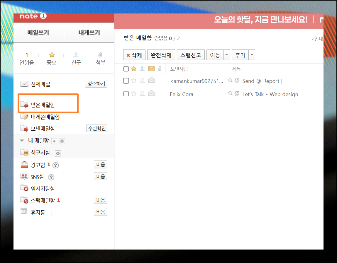 처음 메일함에 들어가면 네이트에서 보낸 환영 메일이 미리 도착해 있을 거예요. 왼쪽 메뉴를 통해 받은 메일함, 보낸 메일함 등 다양한 메일 기능들을 자유롭게 탐색할 수 있어요.