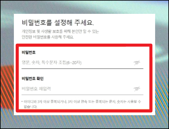 계정 보안의 핵심이 되는 비밀번호를 만드는 중요한 단계입니다. 특수문자와 숫자를 포함한 복잡한 조합으로 설정하시는 것을 강력히 추천 드려요.