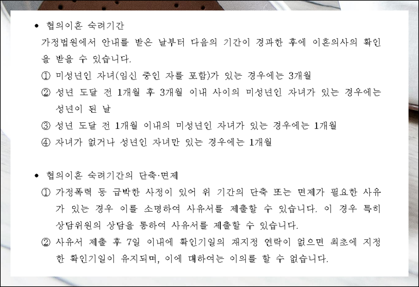 이혼서류 제출만으로는 절차가 끝나지 않아요. 법에서는 숙려기간을 두어 충분히 생각할 시간을 줍니다. 자녀 유무에 따라 기간이 달라지니 참고하세요.