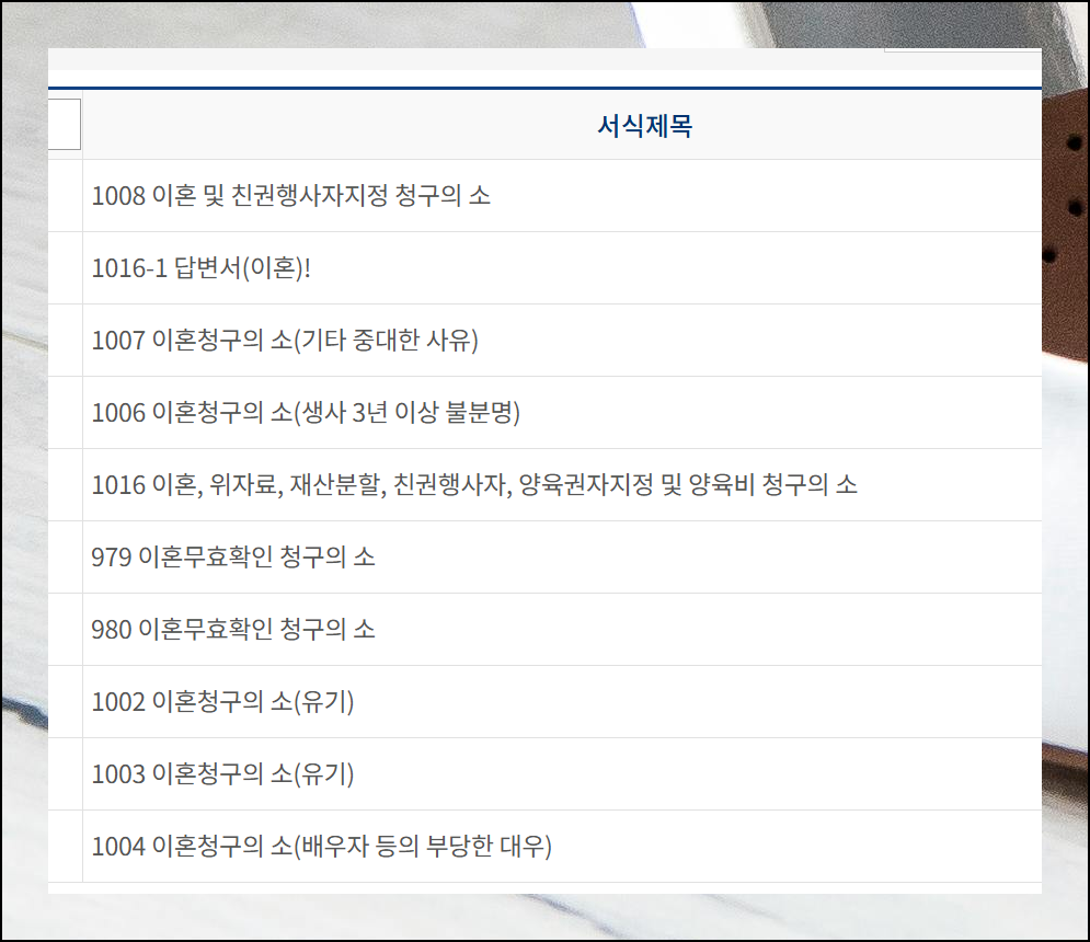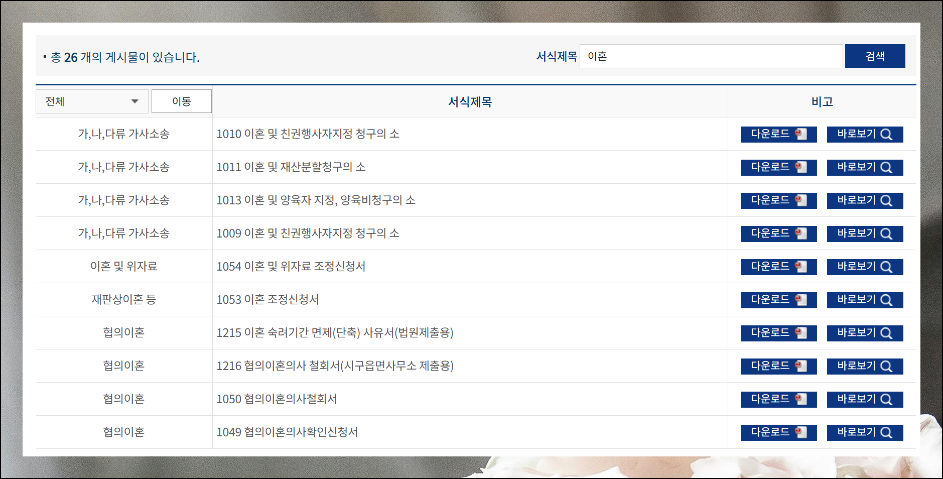 법률구조공단 사이트의 메인 메뉴에서 법률정보 → 법률상식을 차례로 선택하세요. 검색창에 "이혼"을 입력하면 관련 양식을 모두 확인할 수 있어요. 미리 어떤 내용을 담고 있는지 볼 수 있도록 "바로보기" 서비스를 제공하고 있습니다. 어떤 자료를 선택해야 할 지 고민이 되는 경우 해당 서비스를 이용해주세요.