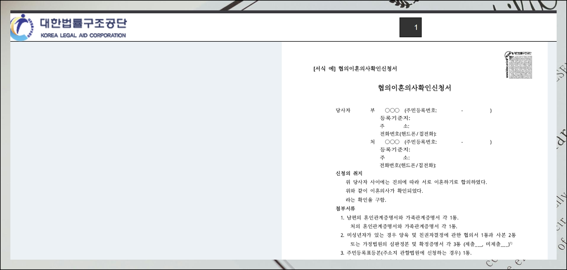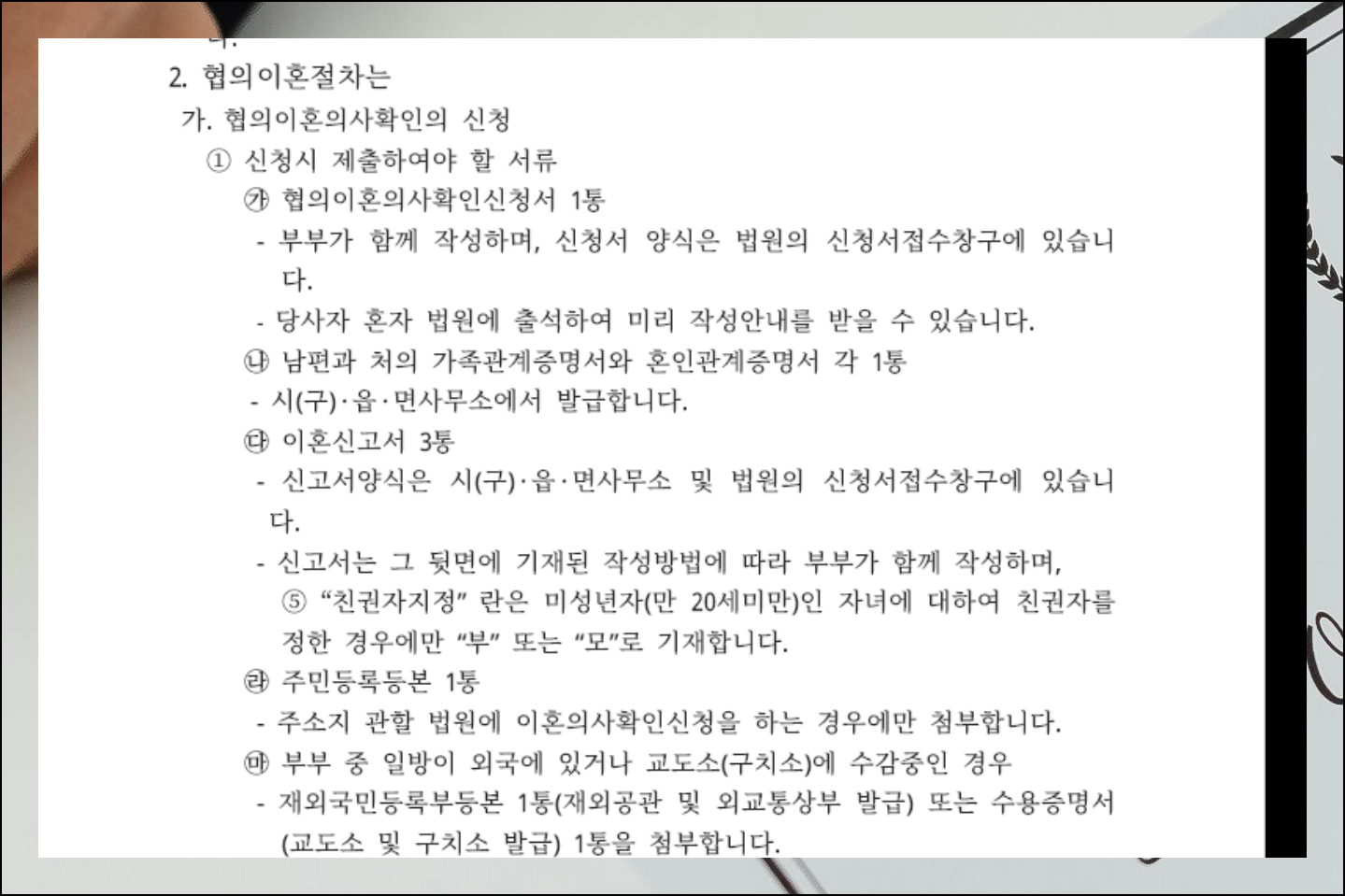 이혼 관련 문서의 두 번째 장부터는 관련 제도에 대한 자세한 설명이 포함되어 있어요. 법원 방문 시에는 해당 양식 하나만으로는 처리가 불가능하고, 다른 증빙 자료들도 반드시 함께 가져가야 합니다. 필요한 서류 목록을 미리 확인해서 모든 것을 한 번에 준비해가는 것이 효율적입니다.