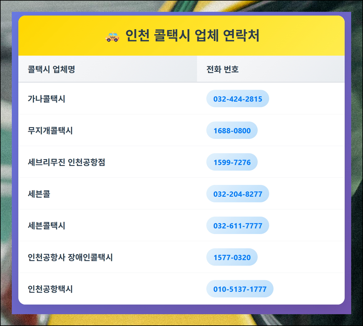 인천 지역의 콜택시 회사 연락처를 직접 수집해서 정리했어요. 인천 기반의 업체들이라 빠른 호출 서비스를 받을 수 있어요. 전화번호만 있으면 콜택시 이용하거나 부르는 법은 생각보다 간단해요. 회사에 전화하면 친절한 직원이 응답할 거예요. 현재 위치와 가고 싶은 곳만 알려주시면 돼요. 인근의 택시 한 대가 바로 출발해서 고객님 위치로 향할 거예요. 승차한 후 목적지까지 이동하고 도착하면 미터기 요금을 결제하면 모든 과정이 끝나요.